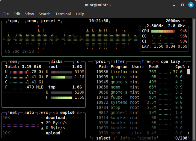 en commençant par le plus indispensable d'entre eux (progress, anciennement pv) et en finissant par le plus impressionnant graphiquement parlant (btop). Au milieu, ncdu n'est pas mal non plus...