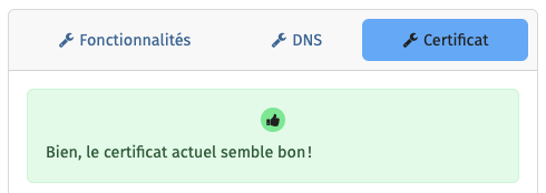 Il reste à vérifier dans l'interface graphique d'administration de Yunohost que notre nouveau certificat X.509 est bien reconnu pour ce domaine.